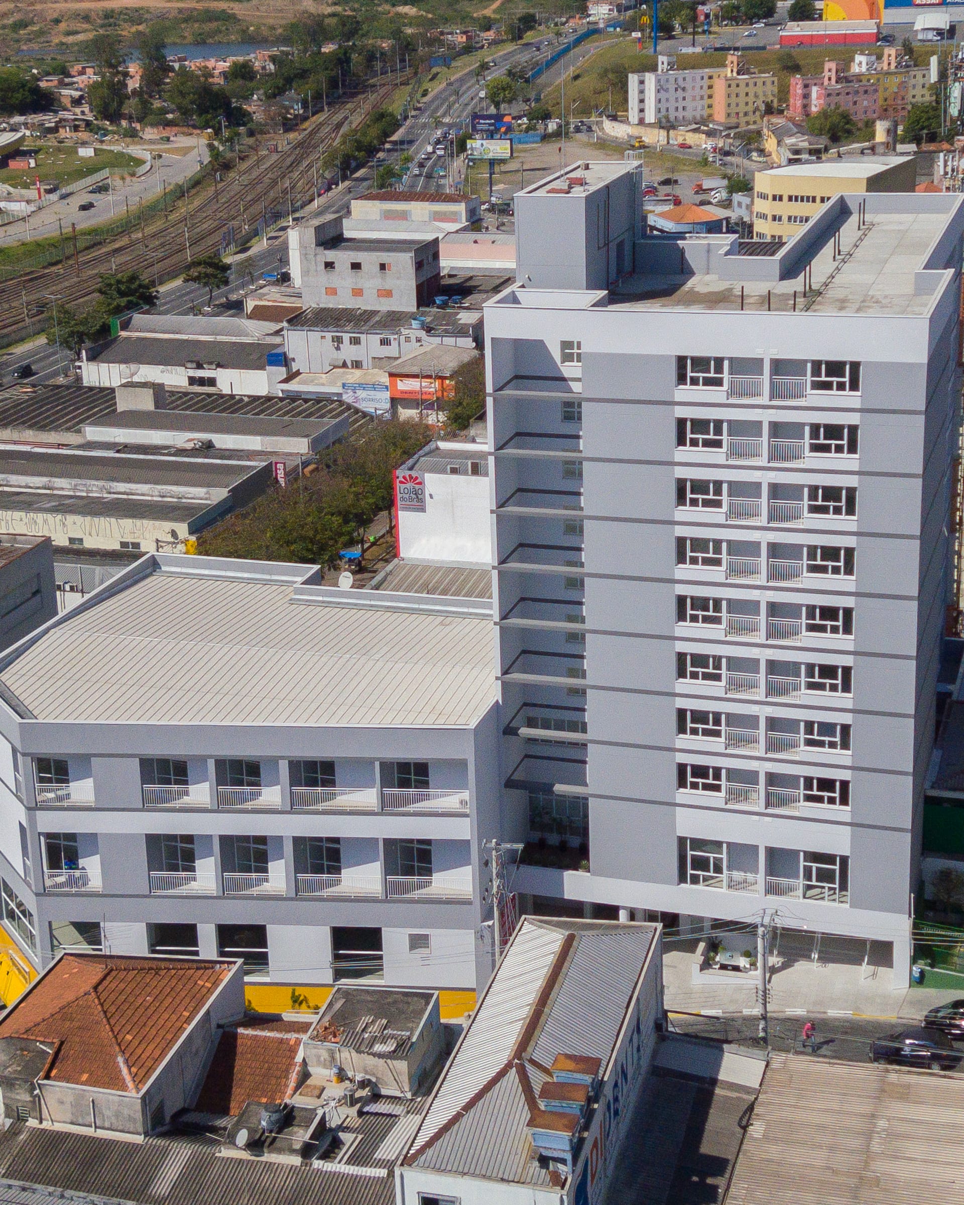 As vistas panorâmicas para a cidade criam uma conexão visual constante entre os ambientes internos e o contexto urbano. Os múltiplos pavimentos oferecem diferentes perspectivas da região, valorizando a inserção do edifício na malha urbana de Carapicuíba.