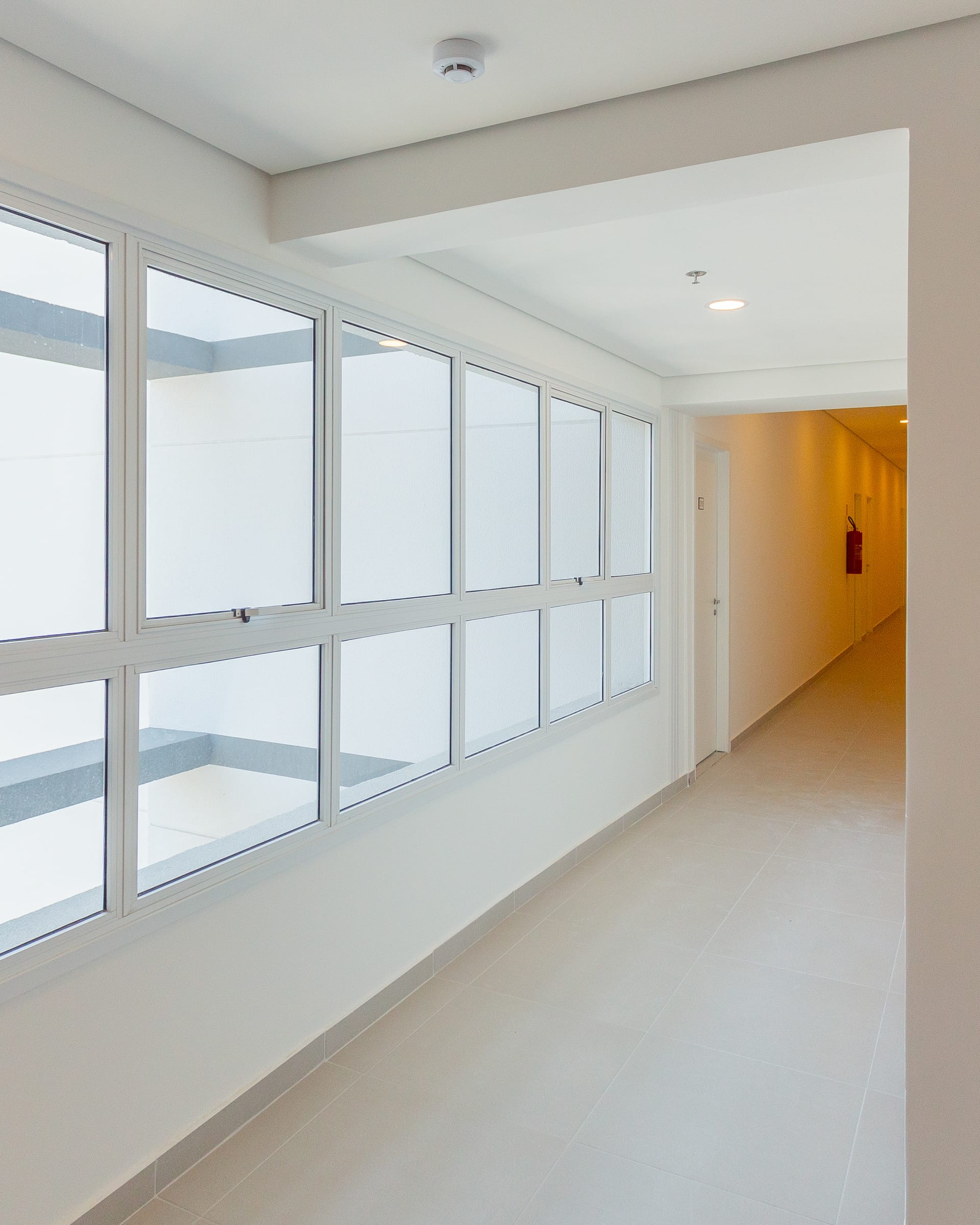 Os corredores internos também recebem iluminação natural através de aberturas estrategicamente posicionadas, criando espaços de circulação confortáveis e bem iluminados ao longo do dia.