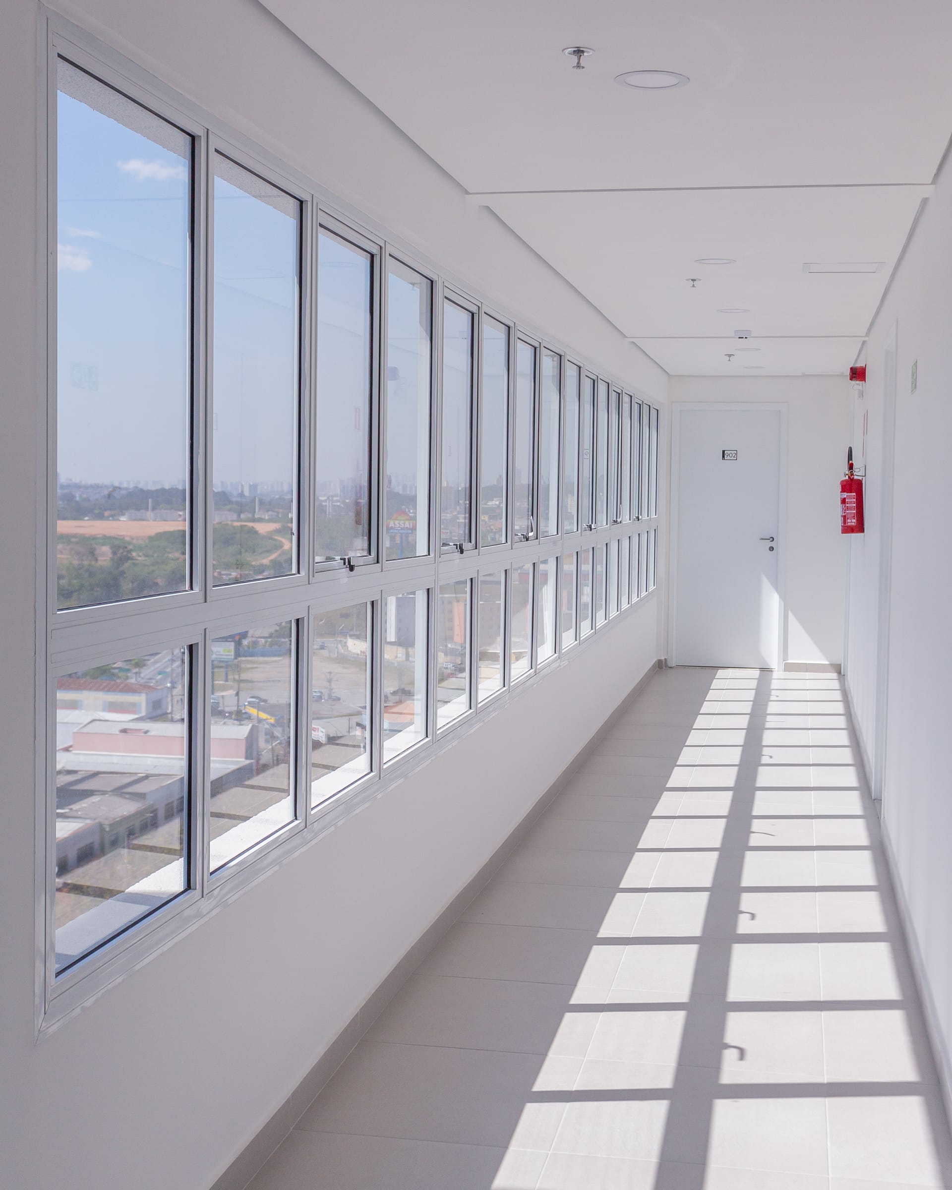 Um dos destaques do projeto é a generosa entrada de luz natural em todos os pavimentos. As grandes janelas de piso a teto, distribuídas ritmicamente nas fachadas, criam ambientes luminosos e conectados visualmente com a cidade. Os caixilhos maxim-ar e de correr garantem ventilação natural cruzada, contribuindo para o conforto térmico e a qualidade do ar interno.