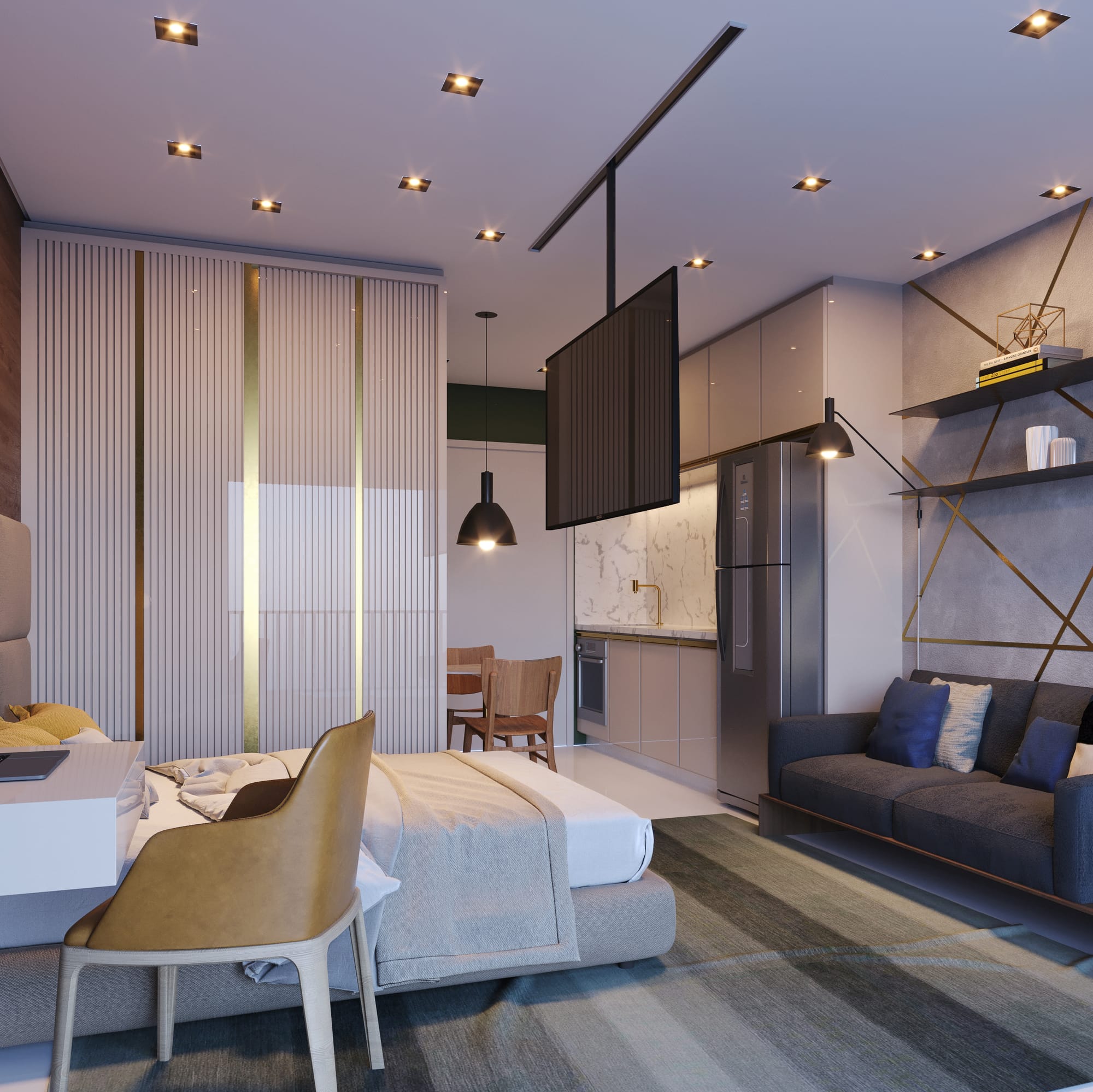 - Unidades Compactas: Os interiores das unidades de 25 m² foram projetados para oferecer máxima percepção de amplitude, utilizando marcenaria inteligente e integração de ambientes para garantir conforto sem abrir mão da funcionalidade.