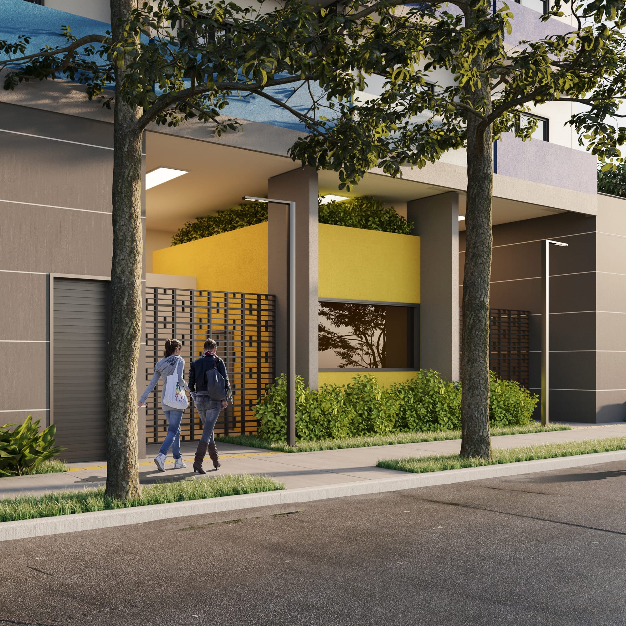 A fachada se destaca pelo ritmo visual dinâmico, utilizando uma paleta de cores sóbria pontuada por tons de azul, que conferem identidade e modernidade à paisagem urbana. No térreo, a integração com a cidade é reforçada por duas lojas de uso comercial, promovendo a fachada ativa e a conveniência para os moradores e pedestres.