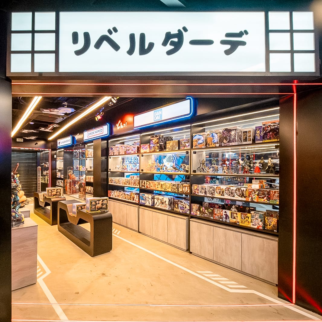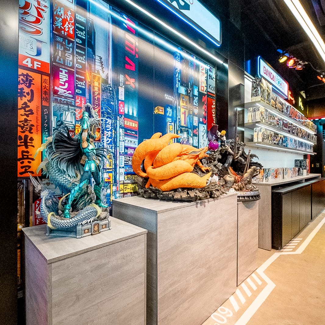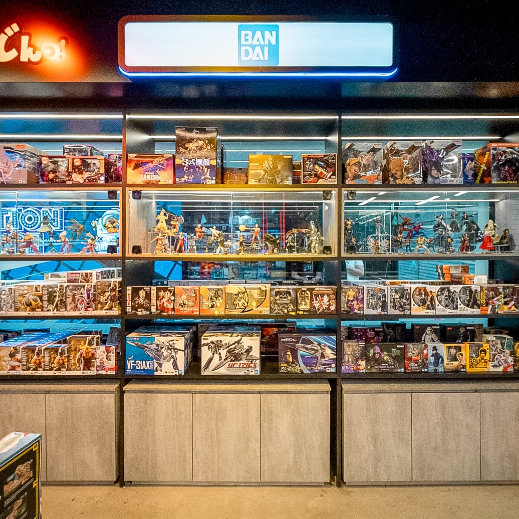 - prateleiras organizadas por marcas icônicas como Bandai, Tamashii Nations e NECA, facilitando a curadoria do colecionador.