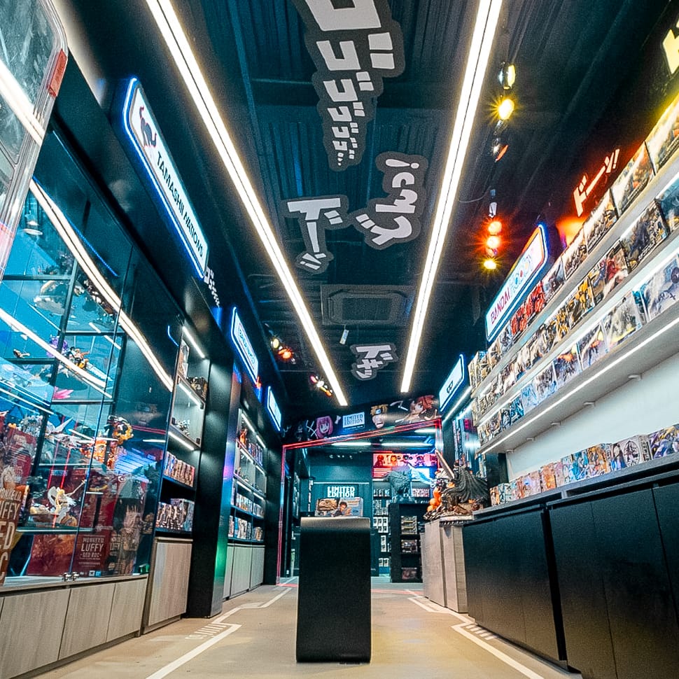A iluminação é um dos grandes diferenciais do projeto. O uso de faixas de LED coloridas, em tons de vermelho, azul e verde, cria contrastes dramáticos que remetem ao estilo cyberpunk e às metrópoles asiáticas. O teto, com elementos gráficos e tipografias japonesas suspensas, amplia a sensação de imersão e reforça a identidade cultural da loja.