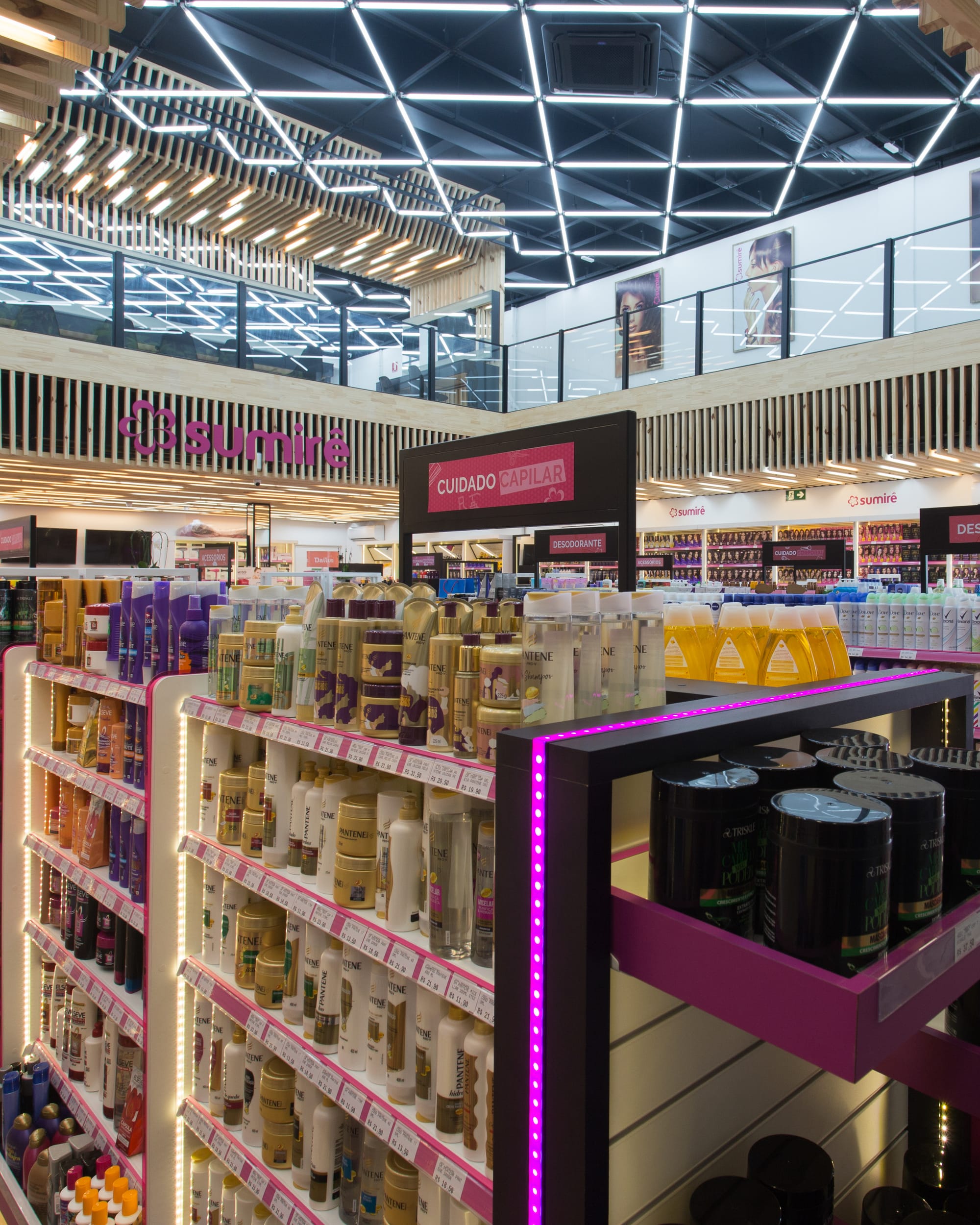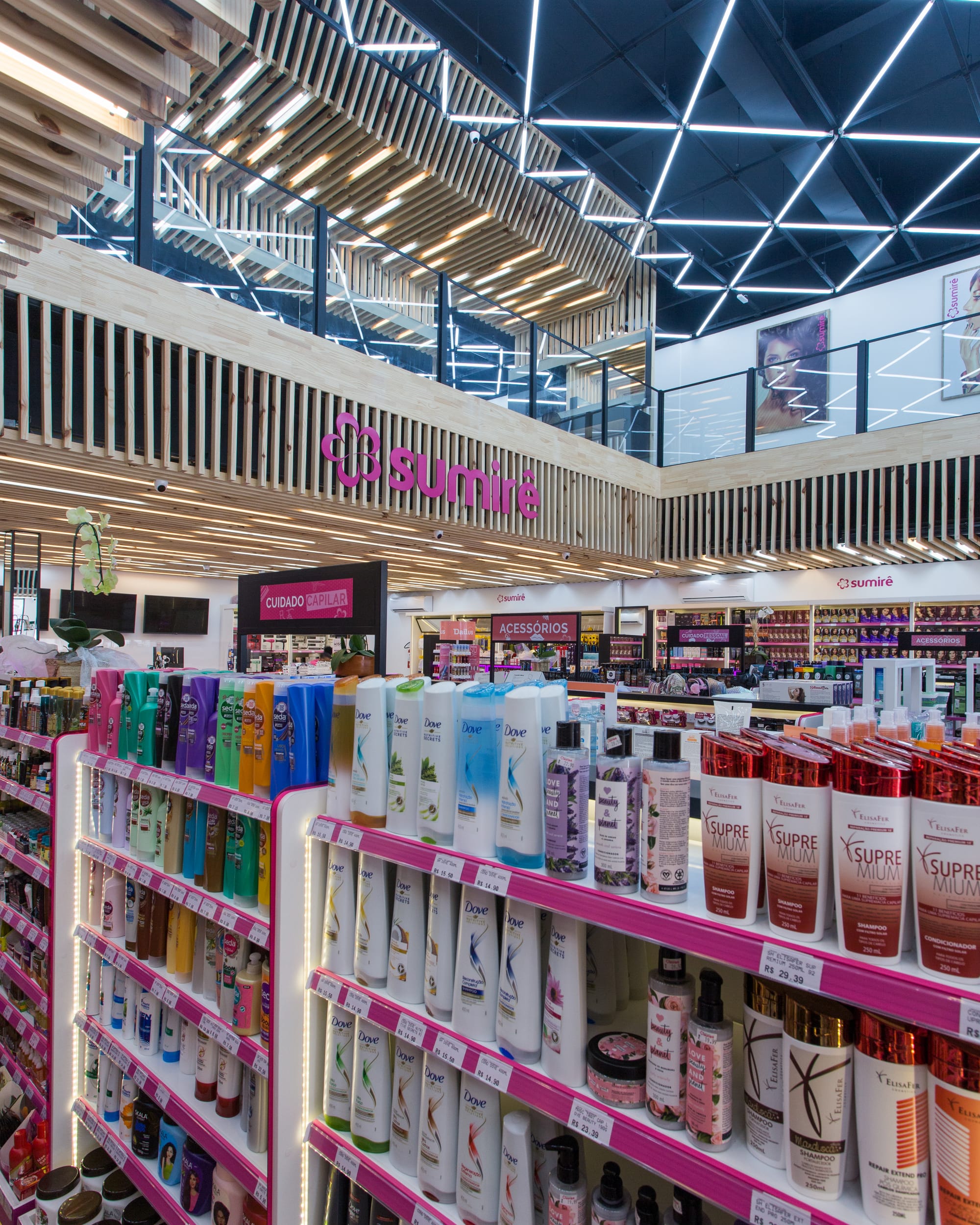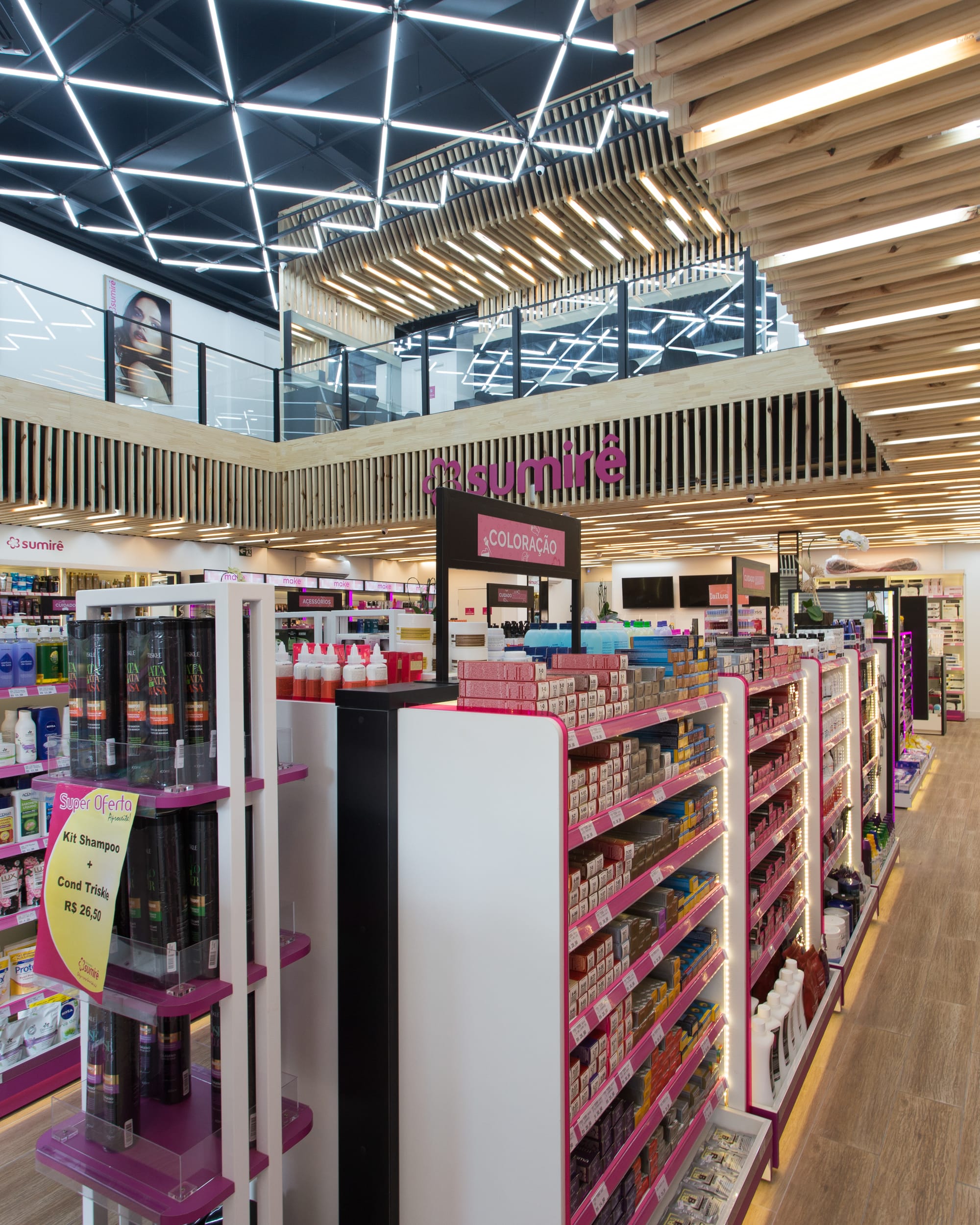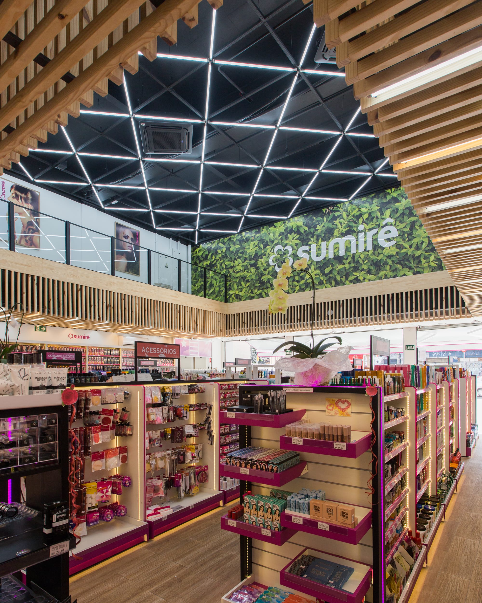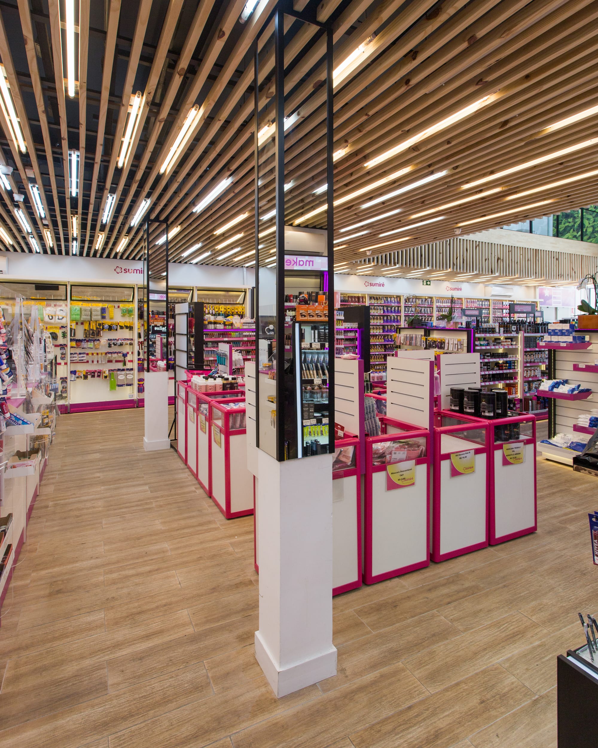 - Identidade de Marca: O uso estratégico do rosa, cor assinatura da Sumirê, é aplicado nos detalhes das gôndolas e balcões de atendimento, contrastando elegantemente com o piso amadeirado e a paleta neutra, garantindo que a marca seja o centro da experiência.