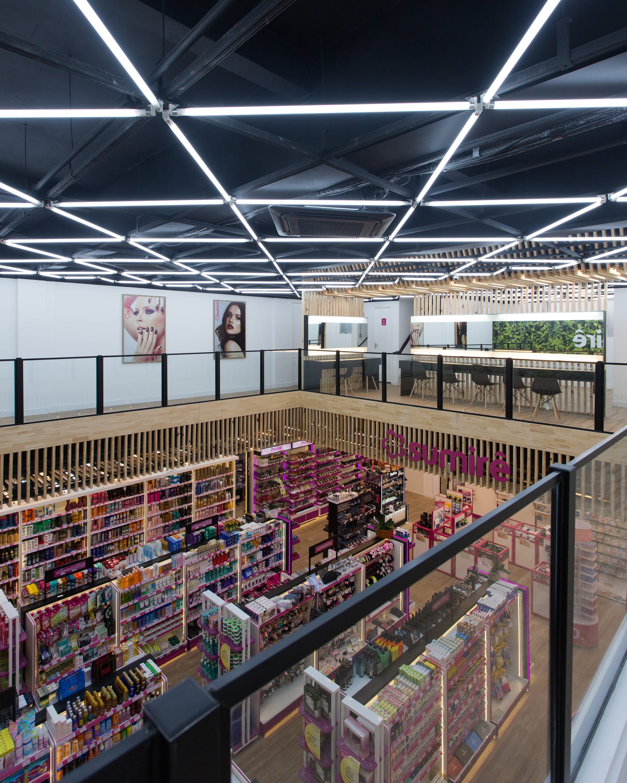 - Layout Otimizado: O projeto de dois pavimentos, conectado por um mezanino com guarda-corpo de vidro, garante a máxima exposição do produto e facilita a circulação, transformando a loja em um verdadeiro hub de beleza.